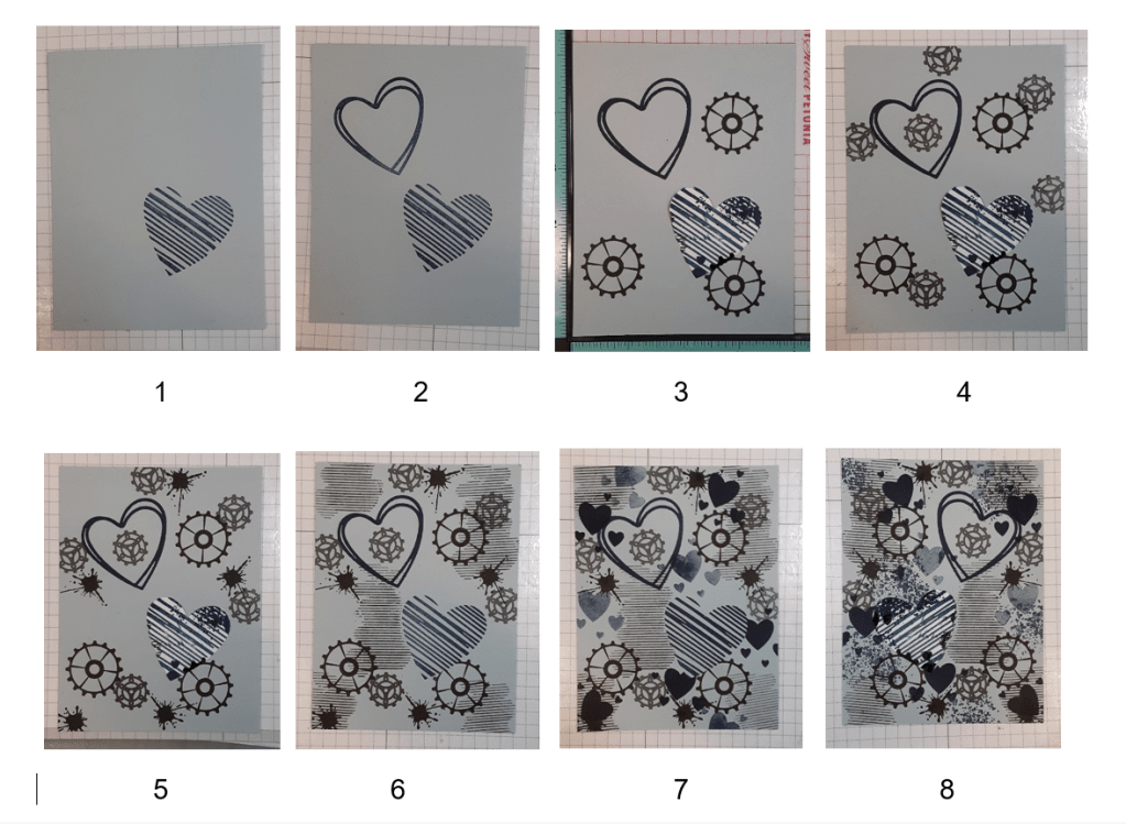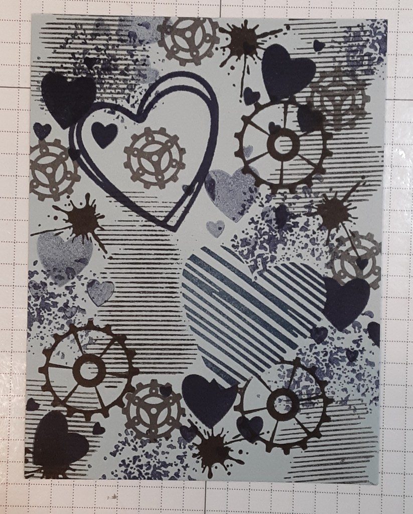 To make the background I used the Endless Love bundle and Gears & Textures stamp set. 1. I stamped the lined heart with Misty Moonlight ink. 2. I stamped the scribbled heart with Night of Navy ink. 3. I made a mask with Masking Paper and cover the striped heart. Then I stamped the larger gear with Early Espresso ink. 4. I stamped the smaller gear with Basic Gray ink. 5. I stamped the ink splat with Early Espresso ink. 6. I stamped the striped image with stamped off Early Espresso ink. 7. I stamped the heart combination with Night of Navy ink and again stamped off. 8. I stamped the scatter stamp with Misty Moonlight ink. (The picture flipped when I was trying to size it without me realizing it. Sorry about that.)