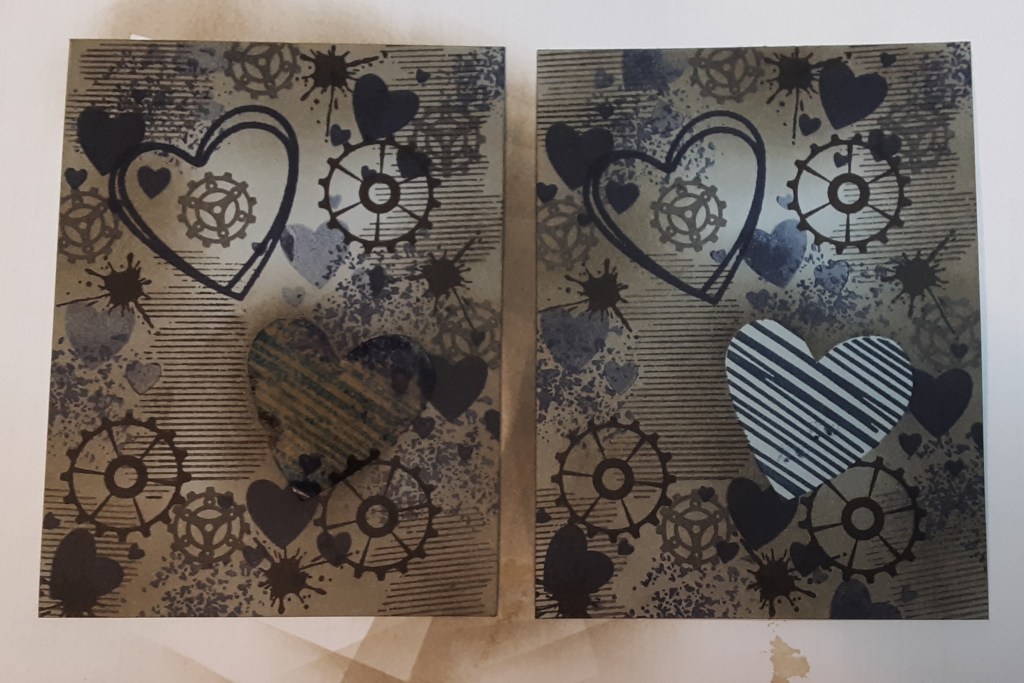 I put the mask back on and used a Blending Brush and Crumb Cake ink around the edges and around the masked heart. When I removed the mask, the striped heart really stood out.