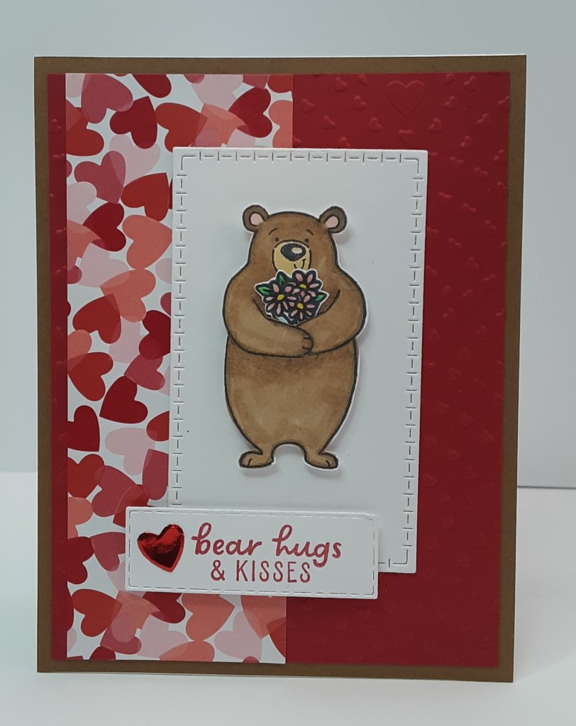 On the smaller rectangle, I stamped bear hugs & kisses in Real Red ink. I adhered my red heart to my label on the left.