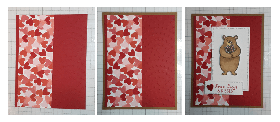 To make the card base, I cut a piece of Pecan Pie cardstock to 5½” x 8½” on my Paper Trimmer, scored and folded at 4¼”, and burnished with my Bone Folder. I cut a piece of Real Red cardstock to 4” x 5¼”. I ran this piece through my Hearts of Love 3D Embossing Folder on my Stampin’ Cut & Emboss Machine. I cut a piece of the Made with Love DSP to 2″ x 5¼”.