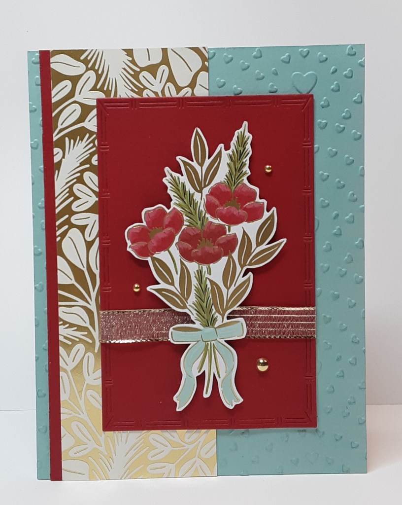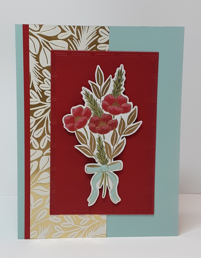 From the Traditions of Christmas Specialty DSP (which is apparently no longer available. UGH!), I fussy cut a bouquet of flowers. Stop by Terry’s shop; she may be able to secure some for you.