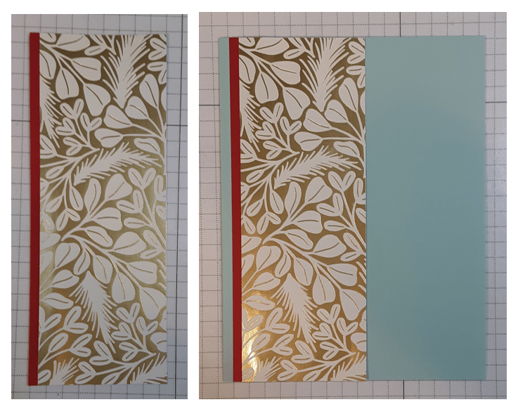 Now onto the card! To make the card base, I cut a piece of Pool Party cardstock to 5½” x 8½” on my Paper Trimmer, scored and folded at 4¼”, and burnished with my Bone Folder. I cut a strip of Real Red cardstock to 5½” x ½”. I cut a strip of Season of Green and Gold Specialty paper to 2″ x 5½”. This paper is from last year and is retired but a good substitute could be Lovely & Beautiful Specialty Paper. It has a pretty gold foiled pattern that would work on this card.