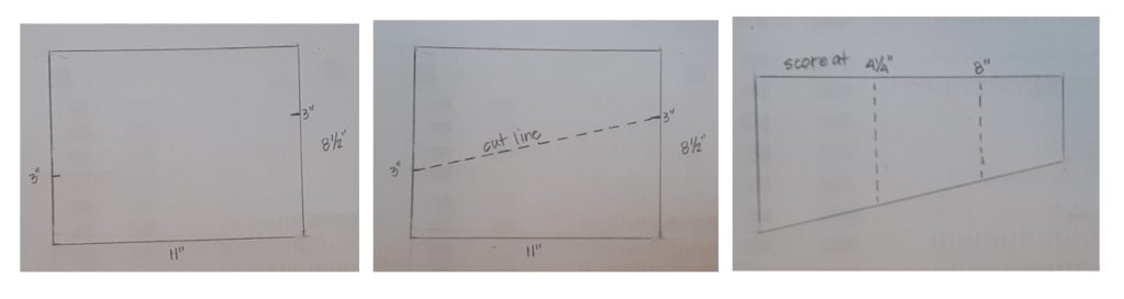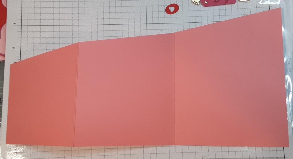 To make the card base I started with an 8½” x 11” sheet of Flirty Flamingo cardstock. I marked 3″ down from the upper right-hand corner on the 8½” edge and up from the bottom left-hand side with a pencil. I lined the tick marks up in the track of my Paper Trimmer and cut diagonally across the paper. This actually makes two card bases. I scored at 4¼” and 8″ and folded in a Z fold with the two largest sections making a valley fold and the smallest section folding back. I burnished my folds with a Bone Folder.