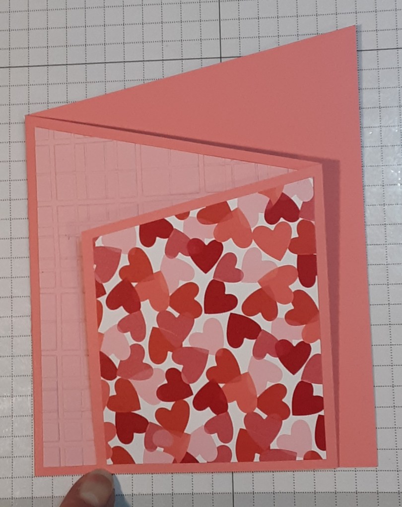 I added some hearts to the middle panel, peeking out from behind the front panel. You could add additional hearts to the backside of those on the middle panel if you don’t want the partial hearts showing when you open the card. Can you see the stray Dimensional backing on the card below? Those little boogers stick to everything!