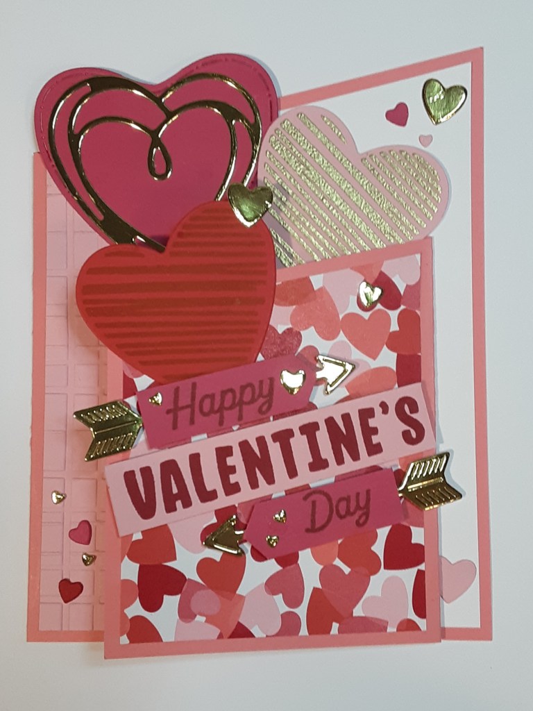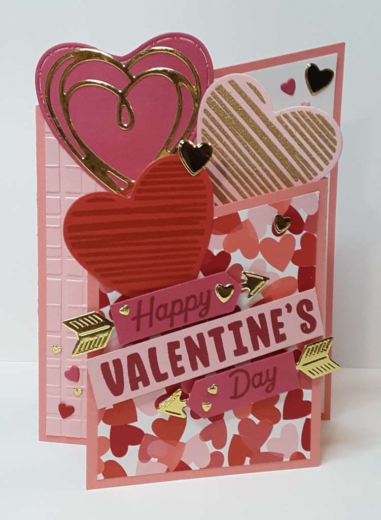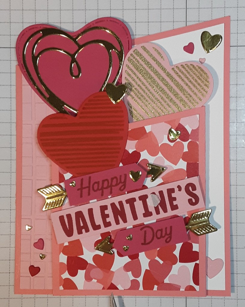 I stamped with Versamark ink the striped heart on Pretty in Pink cardstock. I sprinkled it with Gold Metallic Embossing Powder and heat set it with my Heat Tool. After it cooled, I die cut it with the coordinating heart from the set on my die machine. I used Poppy Parade ink with the same stamp (after cleaning it) on Poppy Parade cardstock for a tone-on-tone look and cut it with the coordinating die. I die cut the various other hearts and arrows from Melon Mambo cardstock, Gold Foil Sheets, Poppy Parade cardstock, and Real Red cardstock.