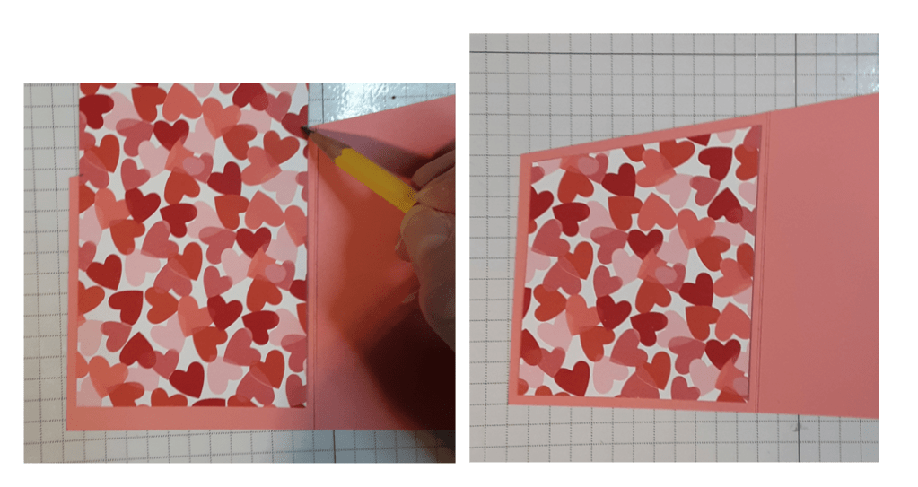 With the Made with Love DSP, I cut a 3″ strip. I put one end of the strip on my card base and made a pencil mark where I wanted to cut the DSP so the angles would match. I lined the pencil marks in the track of my trimmer and cut. Notice in the photos that I slid the paper up ¼” from the bottom instead of ⅛” to give me ⅛” borders all around.