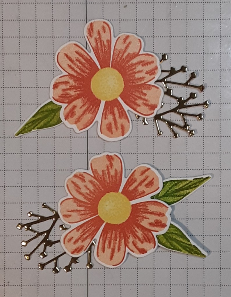 I stamped using the Impressions Abloom stamp set. This set is on the Last Chance List for only $8.00! What a bargain. The dies have already sold out, but the images are easy to fussy cut. I stamped the detailed image first with Calypso Coral ink on Basic White cardstock. I stamped the solid image with Petal Pink ink. I stamped the centers with Lemon Lolly ink (solid image) and Daffodil Delight ink (detailed image). I stamped two flowers this way. I was able to die cut these out since I have the dies.