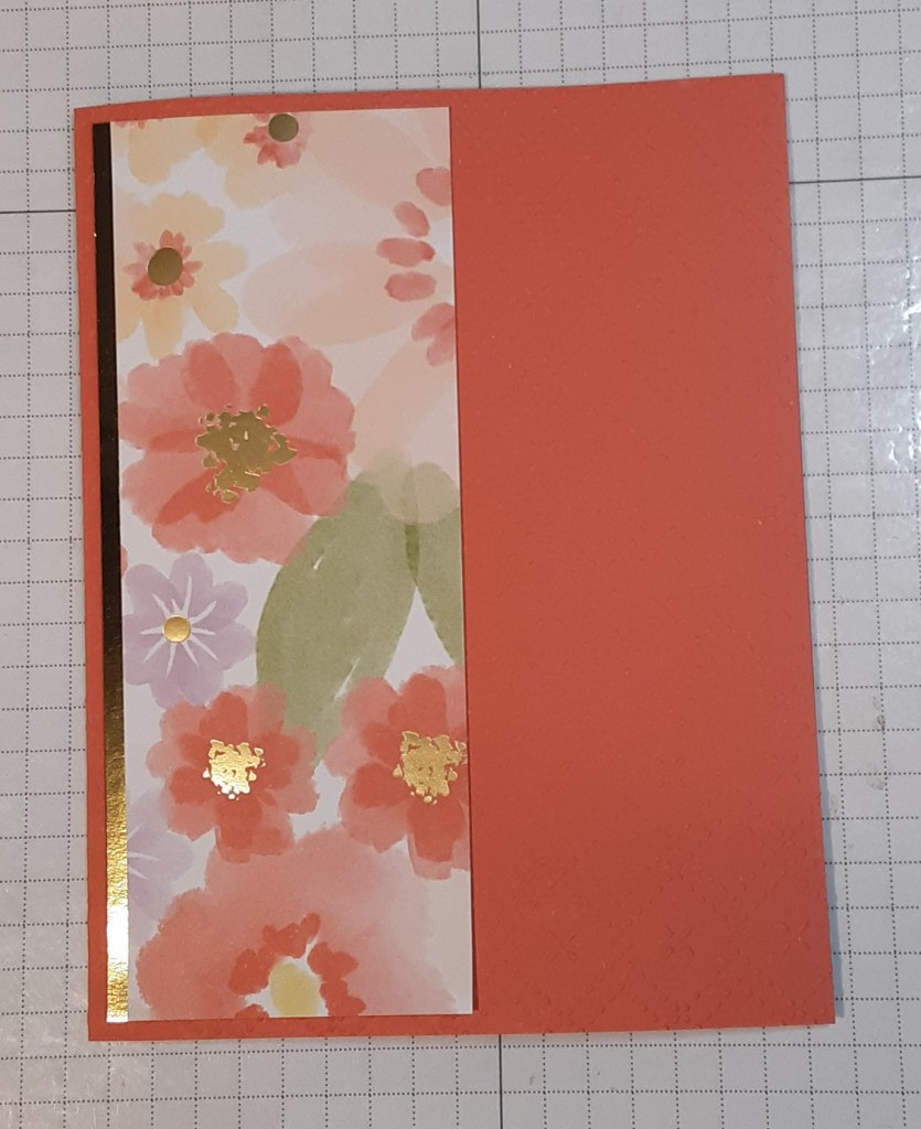 Next, I cut a piece of Gold Foil Sheets to ½” x 5¼”. I cut a piece of Lovely & Beautiful Specialty DSP to 2″ x 5¼”. I adhered the DSP to the gold strip, trimming any uneven ends, and added it to my card base.