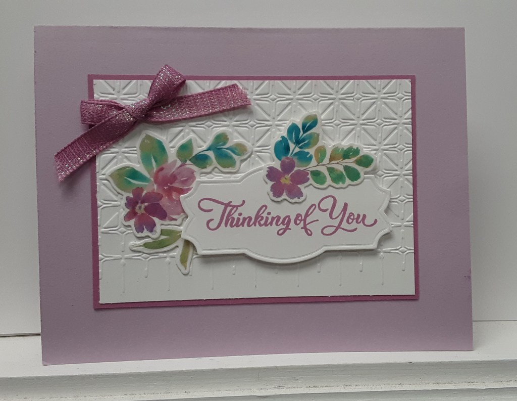 To make the card base, I cut a piece of Fresh Freesia cardstock to 5½” x 8½” on my Paper Trimmer, scored and folded at 4¼”, and burnished with my Bone Folder. I cut a piece of Petunia Pop cardstock (a soon to be retiring In Color!) to 4⅛” x 2⅞”. I cut a piece of Basic White cardstock to 4″ x 2¾”. I ran this last piece through an embossing folder (that is no longer available) on my Stampin’ Cut & Emboss Machine. You could use the Damask Designs Embossing Folder or the Forever Plaid Embossing Folder. I adhered the white piece on the Petunia Pop mat with my favorite adhesive (Multipurpose Liquid Glue or Stampin’ Seal).