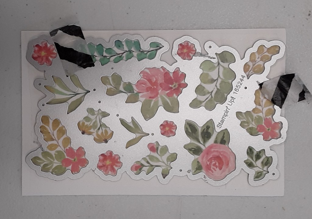 I used the Extraordinary Flora Washi Tape with the coordinating dies. To use the washi tape, you roll out a section that coordinates with the dies and adhere it to a piece of Basic White cardstock. Trim the washi tape at the end of the section. You will want to secure it by pressing it down with your bone folder. Below are two color palettes on the roll. This card uses the one on the left. To adjust the color palette for the one on the right, you could use Pretty in Pink and Sweet Sorbet. You can make several cards with one panel or a couple elaborate ones.