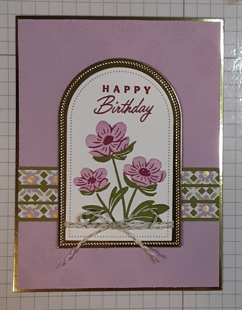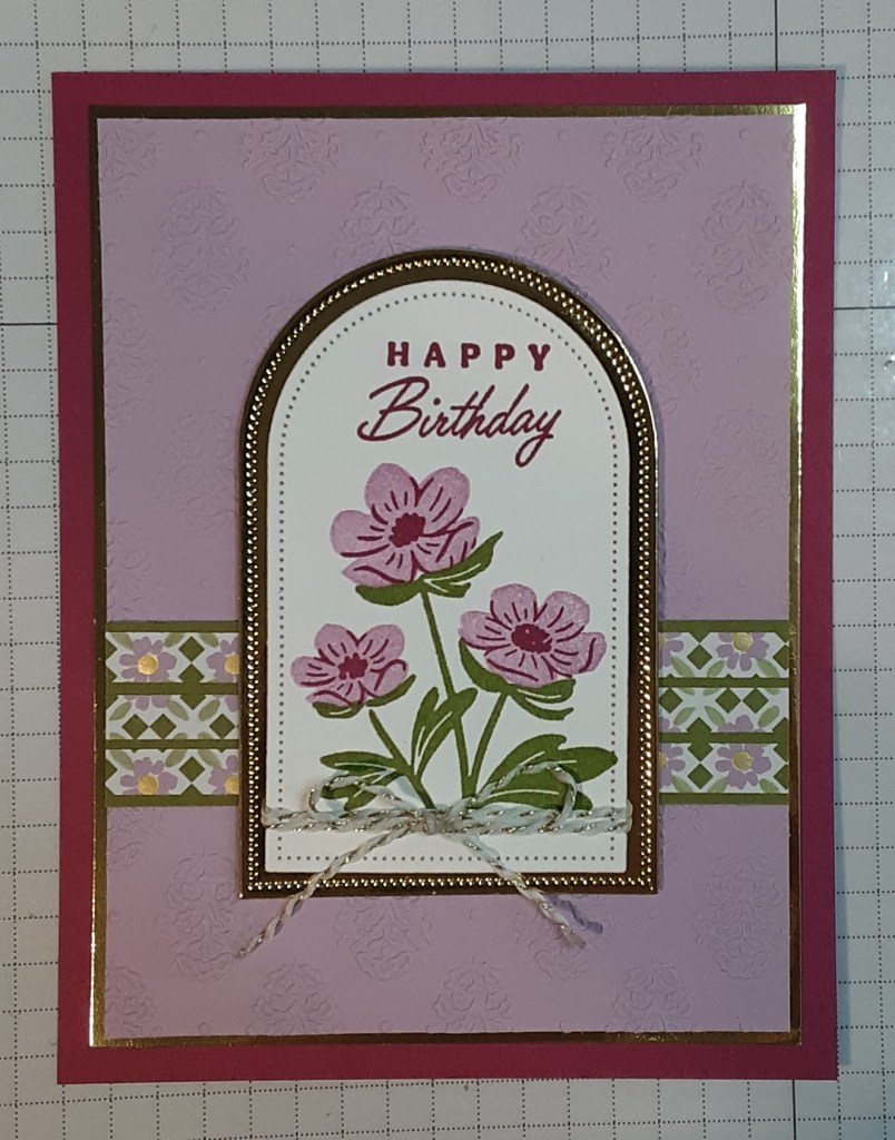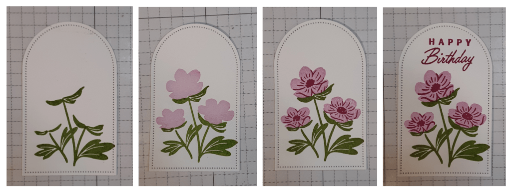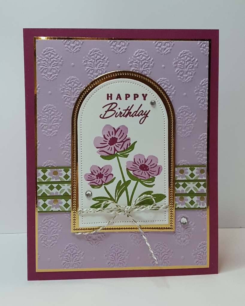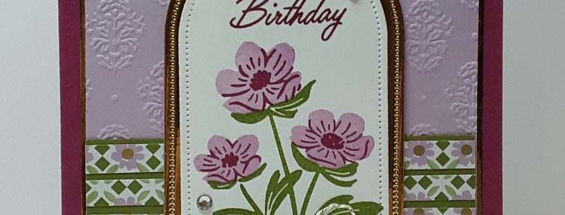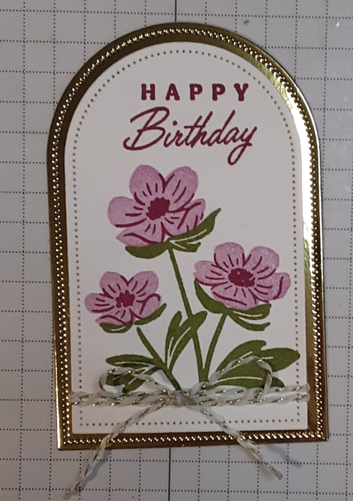I die cut another, smaller arch (2″ base) from Basic White cardstock. I stamped my images on this, starting with the foliage in Old Olive ink from the Pretty Florals stamp set. I stamped the solid flower image with Fresh Freesia ink. I stamped the detailed image with Berry Burst ink. I decided to make this a birthday card and found a suitable Happy Birthday in the Addressed to You stamp set. I stamped each word separately (they come separate in the set) with Berry Burst ink starting with Birthday.