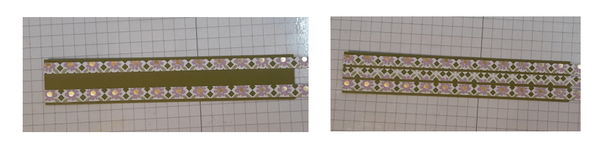 Next, I lined my DSP strips on my Old Olive strip before gluing them down. The space between the strips is 1/16″. I started with the two outside strips. I added the middle strip last, making sure everything was even. I kept my strips in order before gluing with my favorite adhesive (Multipurpose Liquid Glue or Stampin’ Seal).