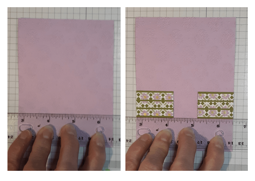 I adhered my DSP strip to my Fresh Freesia piece 1¼” from the bottom. I used my Grid Paper to help line it up. I trimmed the edges.