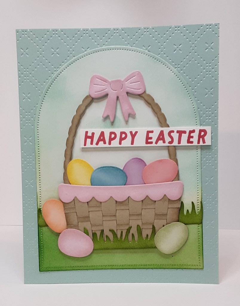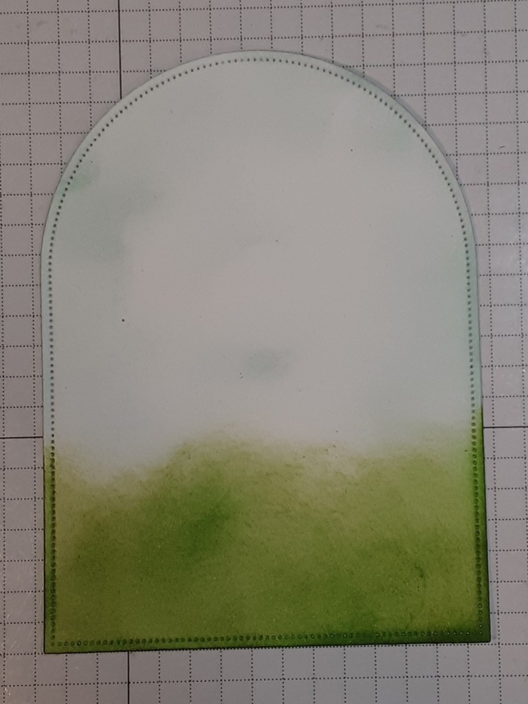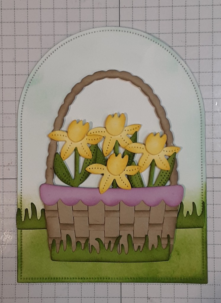 Using the Everyday Arches dies, I cut the second largest arch from Basic White cardstock. With my Blending Brush and some Pool Party ink, I blended color on the top ¾ of the arch. With Granny Apple Green ink, I blended ink on the lower ¼ to act as grass and to provide grounding for my basket.