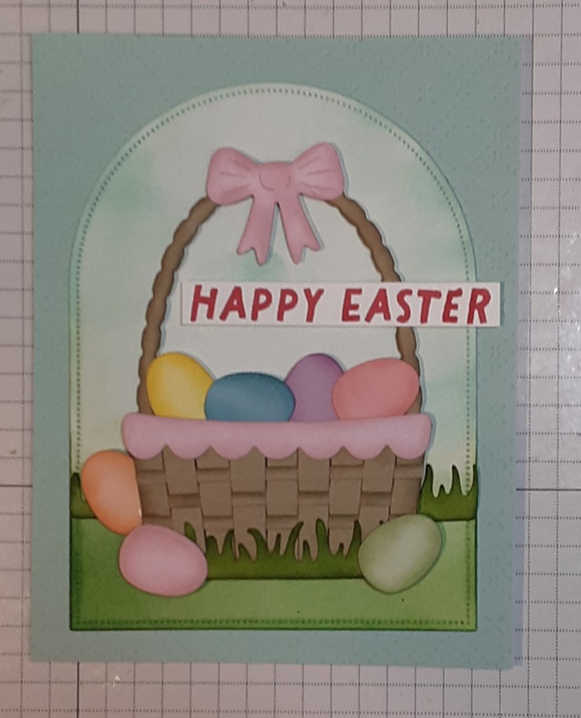 I added my basket of eggs to my arched panel with Stampin’ Dimensionals. I glued the panel to my card base.