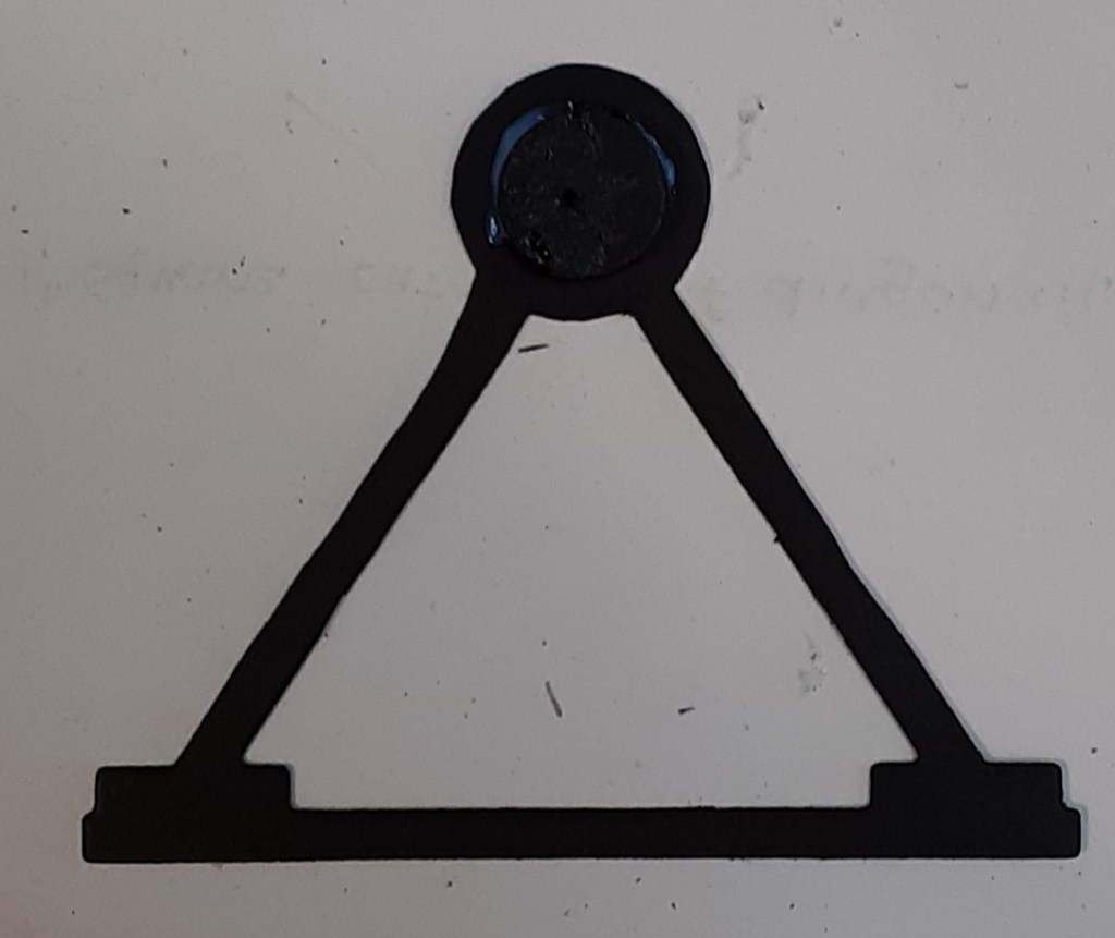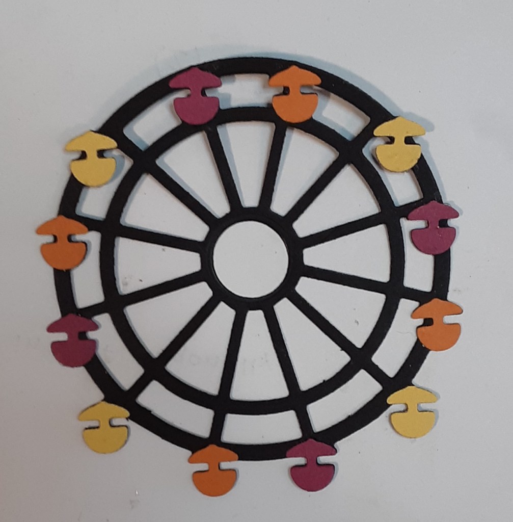 When the glue was dry, I placed the Ferris wheel so the stacked circles were inside the cut-out circle. It’s difficult to see the black on black in the photo. You can put your finger on the stacked circles and test the spin with your other hand.