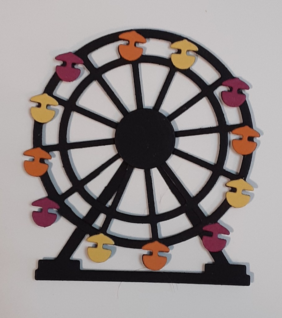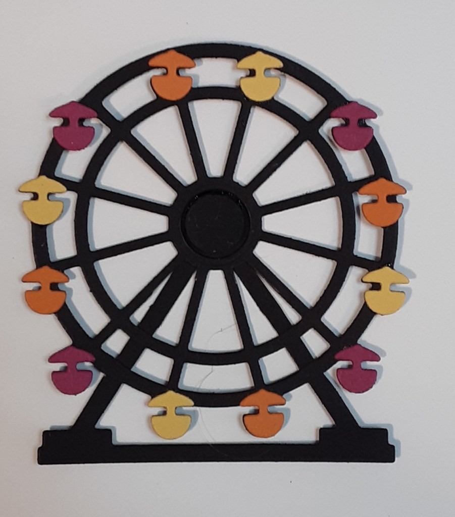 I adhered my DSP to the black mat with my favorite adhesive (Multipurpose Liquid Glue or Stampin’ Seal). I adhered this panel to my card base. I added my Ferris wheel to the card with the edge of my support girders flush with the bottom of the DSP. GLUE ONLY GOES ON THE TRIANGLE SUPPORT PIECE! Do not add glue to the wheel or it will NOT spin.