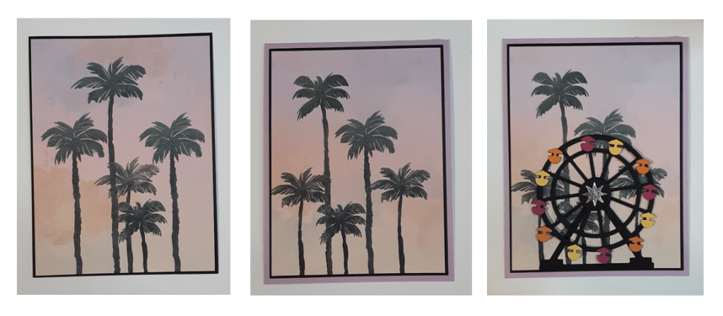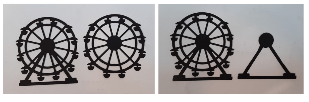To save cardstock, I cut the Ferris wheel from the center of my Basic Black mat piece using the Boardwalk Fun die set from the bundle on my Stampin’ Cut & Emboss Machine. I cut an additional Ferris wheel from a scrap piece. To make the Ferris wheel I needed two pieces, but I had to modify them to make them work. See below how I cut each one. I did use a ruler and a pencil to mark where I wanted to trim them down.