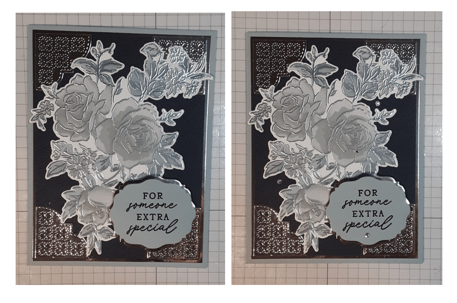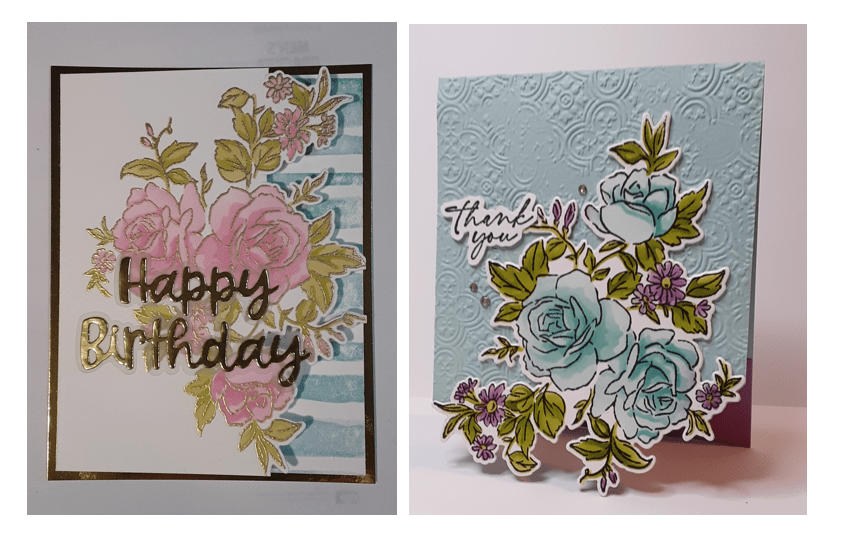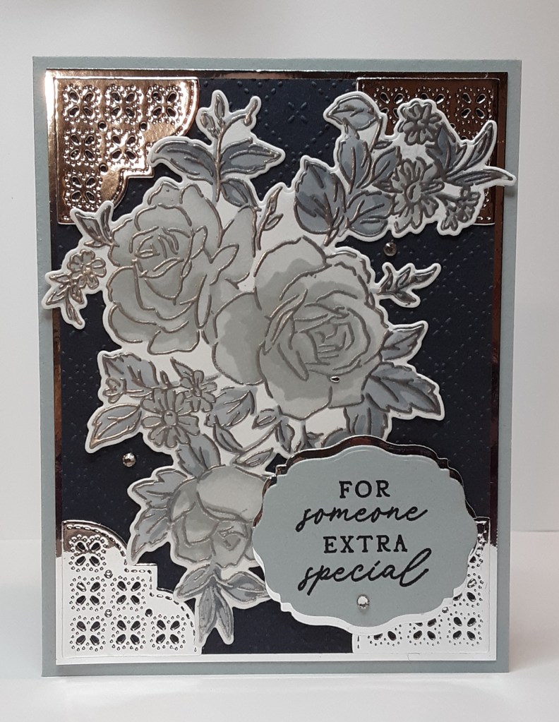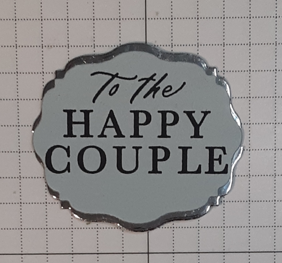 I adhered the sentiment piece to the foil using my favorite adhesive (Multipurpose Liquid Glue or Stampin’ Seal). I prefer tape runner with foil. In the picture, I used a stamp from Simply Beautiful stamp set which is no longer available. Terry may be able to get one for you if you want/need it. My intention for this card was a wedding card.