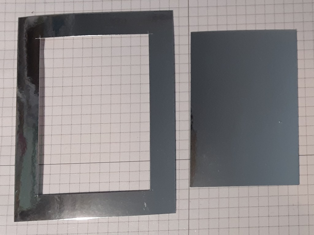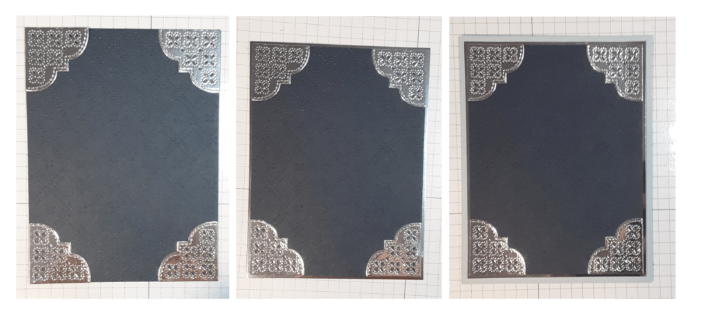 Once I had all my pieces, I assembled my card. I adhered the corners to my Secret Sea piece. I recommend using tape runner for this so that the glue doesn’t ooze through the openings. I adhered this piece to my silver mat (with the inside removed). Finally, I added this panel to my card base.