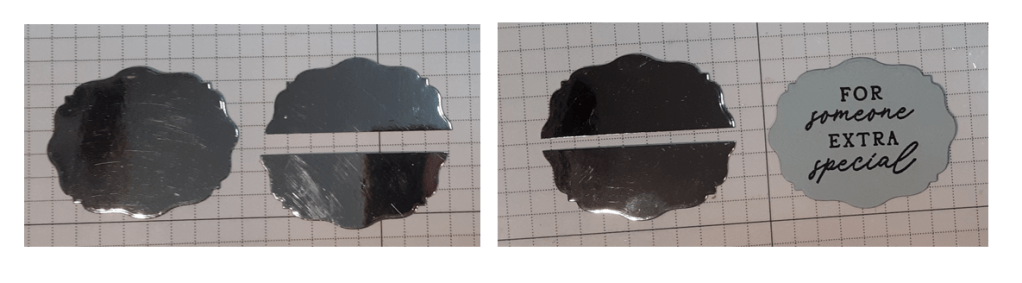 I cut the smallest label from the Beautifully Celebrated die set from Silver Foil. I cut this in half horizontally. I stamped For Someone Extra Special from the 12 Days of Crafting kit in Secret Sea ink on Cloud Cover cardstock. I die cut this also from the smallest label die.