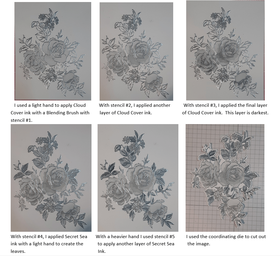 Now on to the focal image. I stamped the large floral image from Layers of Beauty bundle (contains the stamp set, dies, and stencils) with Versamark ink on a 4¼” x 5½” piece of Basic White cardstock. You can prep the paper with anti-static powder for a cleaner image. I sprinkled silver embossing powder from the Metallics Embossing Powders pack and heat set it with my Heat Tool. When heating the embossing powder, keep the heat tool moving to prevent burning. You also don’t want to overheat the embossing powder. I have found heating from the back gives a shinier finish. Below I have the steps for coloring in the image. I started with Cloud Cover ink with a Blending Brush. This ink is on the Last Chance list because the color doesn’t stay true and doesn’t meet Stampin’ Up!’s standards of quality. Make sure to daub off excess ink before applying to your image. I daubed off on my stencil itself and could pick it up as I needed it. No waste!