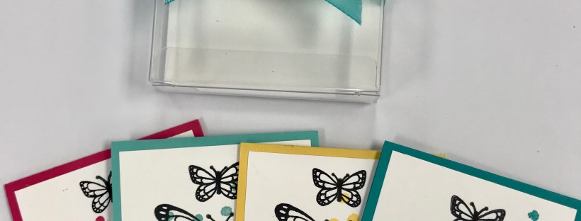 These simple note cards make a great gift! For these cards, I stamped the butterflies from the Butterfly Gala Stamp Set in Basic Black Ink on 2.75" x 2.75" piece of Whisper White cardstock. I stamped various greetings underneath in Basic Black ink. I stamped the series of spots over the butterflies in colors coordinating … Continue reading Simple Butterfly Card Set