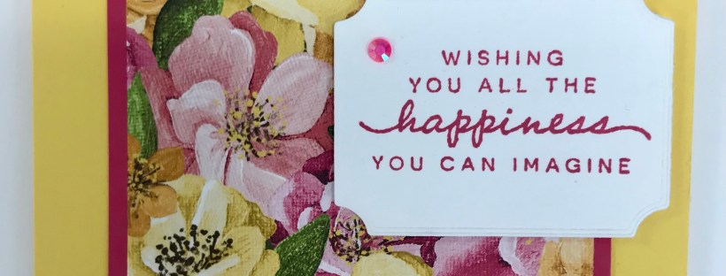 This sweet card features the Hues of Happiness Suite! Save 10% on the stamp set Happiness Abounds! This card has a 8.5” x 5.5” Melon Mambo cardstock base. I wrapped a 3” x 5.5” strip of Hues of Happiness matted on Daffodil Delight cardstock with open weave ribbon. I stamped the “All the Happiness You … Continue reading Floral Wishing You Happiness Card
