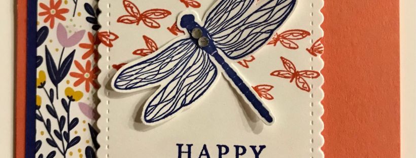 The Calypso Coral in this card makes it so summery! Perfect for any August birthdays! This card starts with a 8.5" x 5.5" piece of Calypso Coral Cardstock. I put a strip of Starry Sky underneath a 5.5 x 1.5" strip of Butterfly Kisses DSP. I stamped the "Happy Birthday" greeting in Starry Sky ink … Continue reading Simple Dragonfly Birthday Card